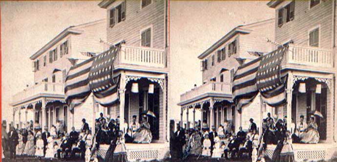 1870s-80s stereo view of a flag draped house in Cape May NJ
