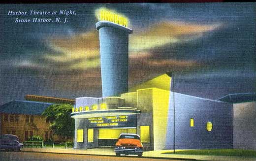 A night time view of the very streamlined Harbor Theatre in Stone Harbor, NJ